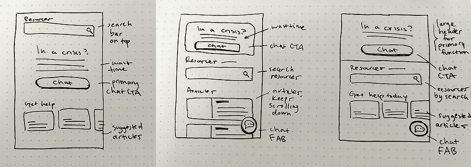 I then created what might be the shortest possible task flow diagram everβ a positive characteristic, as our product wants to streamline the singular goal of connecting the user with a Crisis Counselor as much as possible.