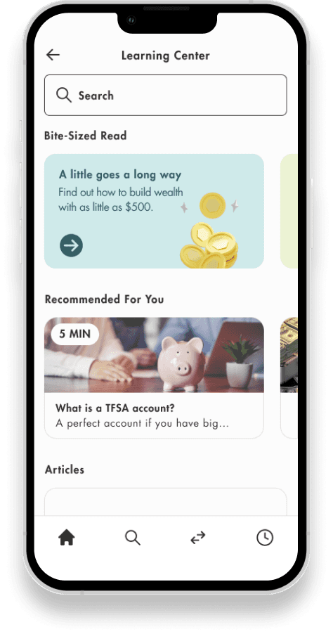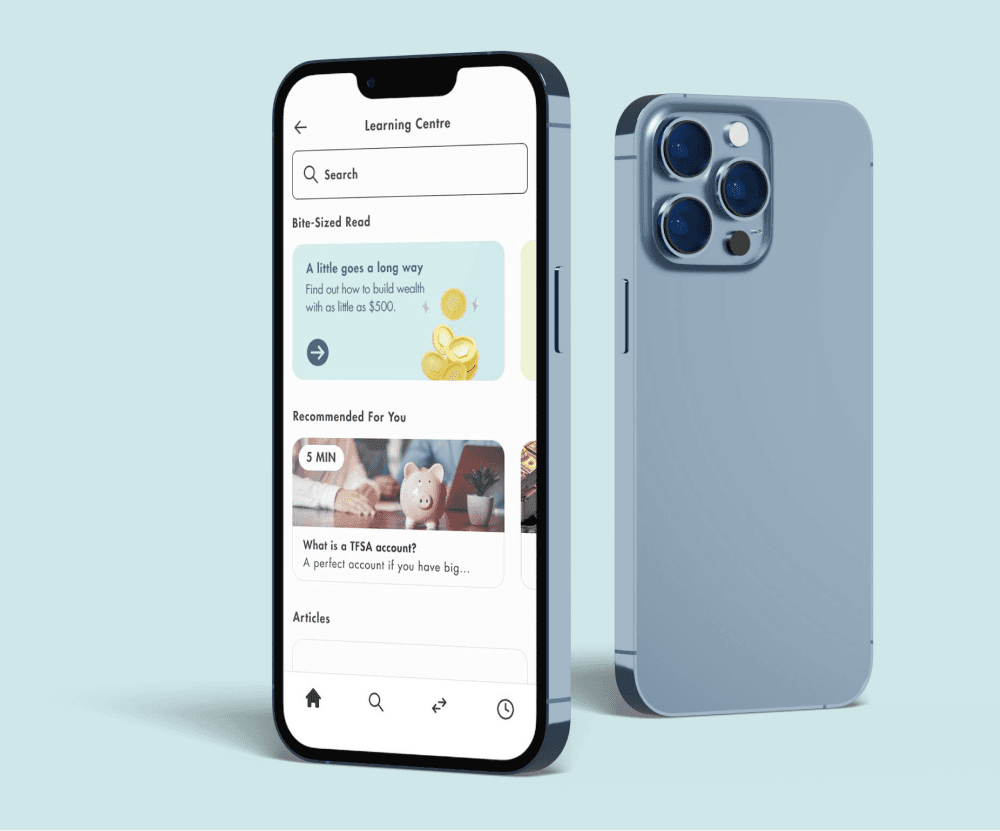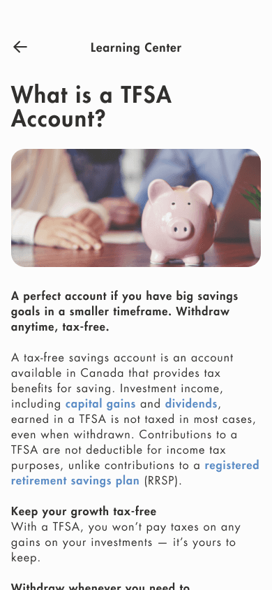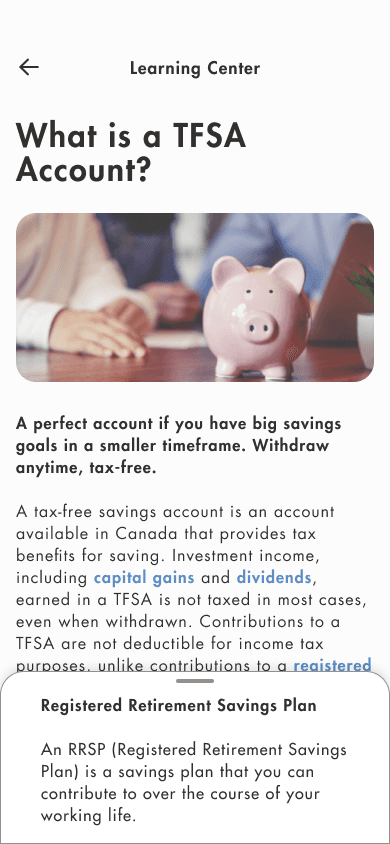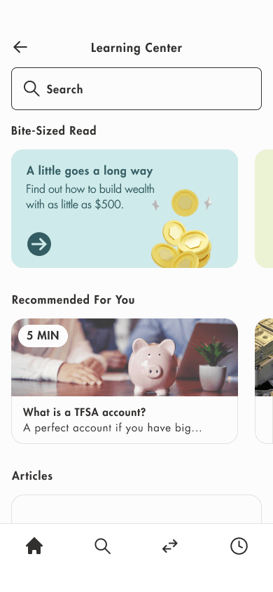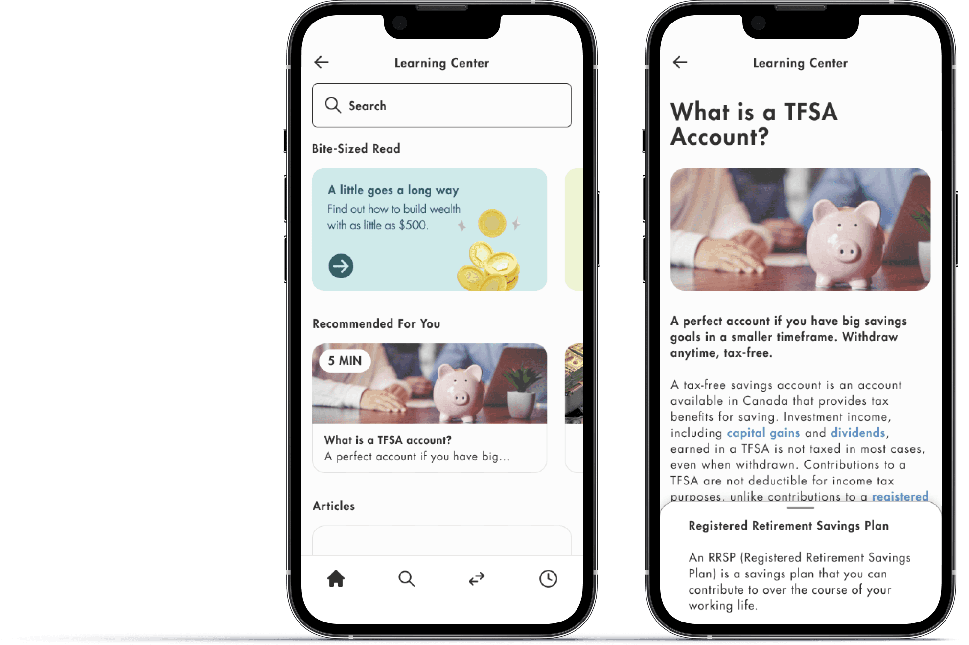 Our solution introduced the addition of a personalized learning experience feature within the Wealthsimple app that encourages the user to increase their financial literacy with personalized articles.